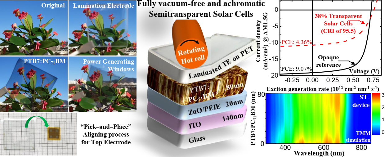 Fully vacuum-free manufacturing could be achieved from a silver nanowire and conductive polymer-based transparent lamination top electrode, thereby achieving complete and concrete electrical contact with the underlying polymer bulk-heterojunction layer through a simple hot-press lamination step. In addition, for the insertion of an appropriate hole-extracting interlayer between the lamination electrode and polymer layer, ST solar cells with a lamination electrode provided the best power conversion efficiency (PCE) of 4.36% with a fill factor (FF) of 53.9%. For comparison, opaque solar cells with a metal top electrode were also fabricated, providing the best PCE of 9.07% with an FF of 65.4%. However, the inferior electricity production of these ST solar cells can be compensated for by its pure achromatic appeal owing to its superior optical properties. Detailed optical analysis was performed to evaluate the compatibility of the lamination electrode-based ST solar cells for power-generating window applications. ST solar cells did not exhibit a noticeable optical cavity resonance effect, resulting in an extremely good visual appearance with achromatic sensation and a window illumination source with luminosity of 38.1%, CCT of 6480 K, and general CRI of 95.5 under D65, which is a standard daylight illuminant.