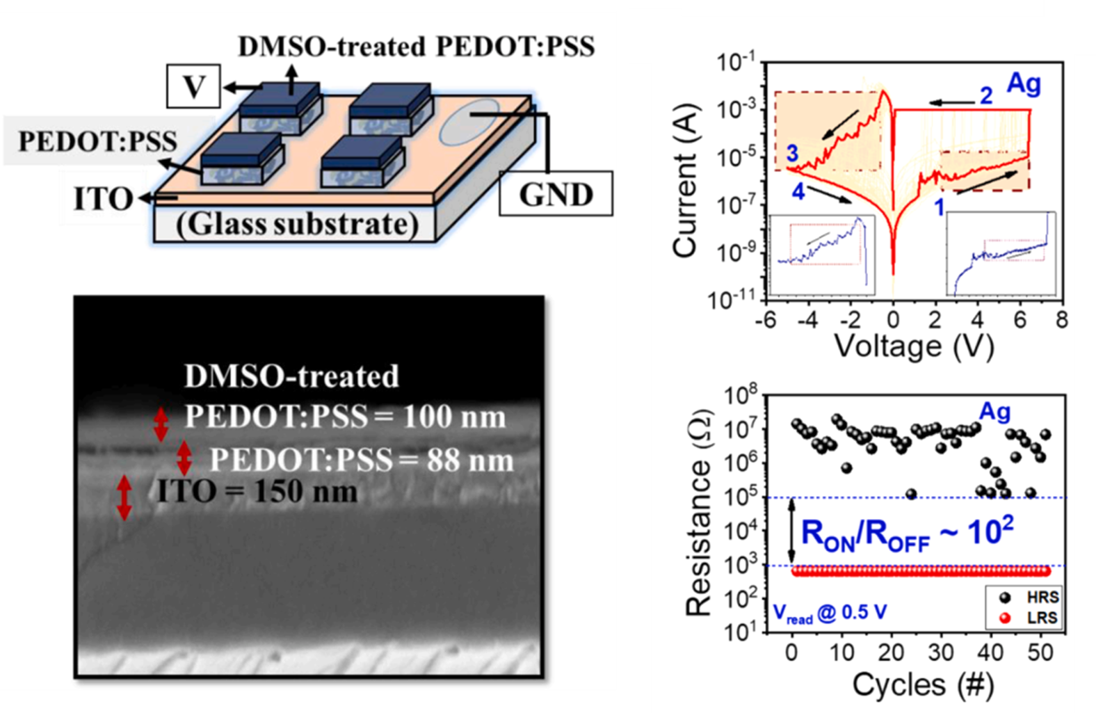 In this study, we present the fabrication of a poly(3,4-ethylenedioxythiophene)-poly(styrenesulfonate) (PEDOT:PSS)-based resistive random access memory (RRAM) device using a fully vacuum-free and solution-processed fabrication method, realized using a printable top electrode. Three different printable electrodes, namely Ag epoxy, ethylene glycol(EG)-treated PEDOT:PSS, and dimethyl sulfoxide(DMSO)-treated PEDOT:PSS, were used as the top electrode of the RRAM device. Different top electrodes exhibited different switching behaviors as volatile or nonvolatile memory devices. Accordingly, the RRAM device with the Ag epoxy top electrode demonstrated nonvolatile bipolar switching with a quantization effect in the RESET process and multilevel switching. Meanwhile, the RRAM device with the EG-treated PEDOT:PSS electrode exhibited abnormal bipolar resistive switching behavior. Lastly, the RRAM device with the DMSO-treated PEDOT:PSS electrode exhibited volatile switching for the highest stability of up to 500 cycles.