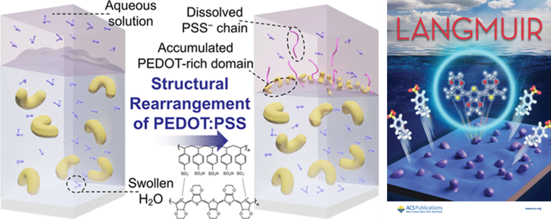 The poly(3,4-ethylenedioxythiophene):poly(4-styrenesulfonate) (PEDOT:PSS) film is a promising material for electrodes, biomolecular sensor channels, and probes for physiological signals because the electrical conduction of PEDOT:PSS is tuned simply through the electrochemical reaction with the target analyte. However, forming a specific morphology or nanostructure on PEDOT:PSS thin films immersed in an aqueous solution is still a challenge. Herein, we report the mechanism for the stepwise morphological change in the highly conductive PEDOT:PSS layer that successfully explains the electrical and structural modulations that occur after a soaking test in various pH conditions. The change in PEDOT:PSS begins with the rapid swelling and dissolution of PSS-rich domains and the simultaneous structural rearrangement of the remaining PEDOT chains within 1 s of dipping. Analysis confirms that the pH conditions of an aqueous solution govern the oxidation state and the form of the PEDOT chains. After removing the water molecules, additional PEDOT-rich grains were generated and accumulated on the surface of the film, which exhibited hydrophobic barrier characteristics. With the help of this intrinsic barrier on the PEDOT:PSS surface, the sheet resistance slightly increased from 72 to 144 Ω/sq even after dipping in a water bath for 350 h. We also demonstrate the usability of the proposed approach on a sensor to detect vitamin C in an aqueous medium. Utilizing the electrochemical reaction of PEDOT:PSS films, the simple resistor sensor showed a response time of less than 150 s, which is 10 times faster than that observed in a previous report. The soaked samples also showed a more reliable linear correlation between the current change and the amount of ascorbic acid compared with pristine PEDOT:PSS. Both the proposed mechanism and the role of accumulated PEDOT-rich regions illustrate the versatile potential of highly conductive PEDOT:PSS films in the field of bioelectronic applications, owing to the increased design architecture.